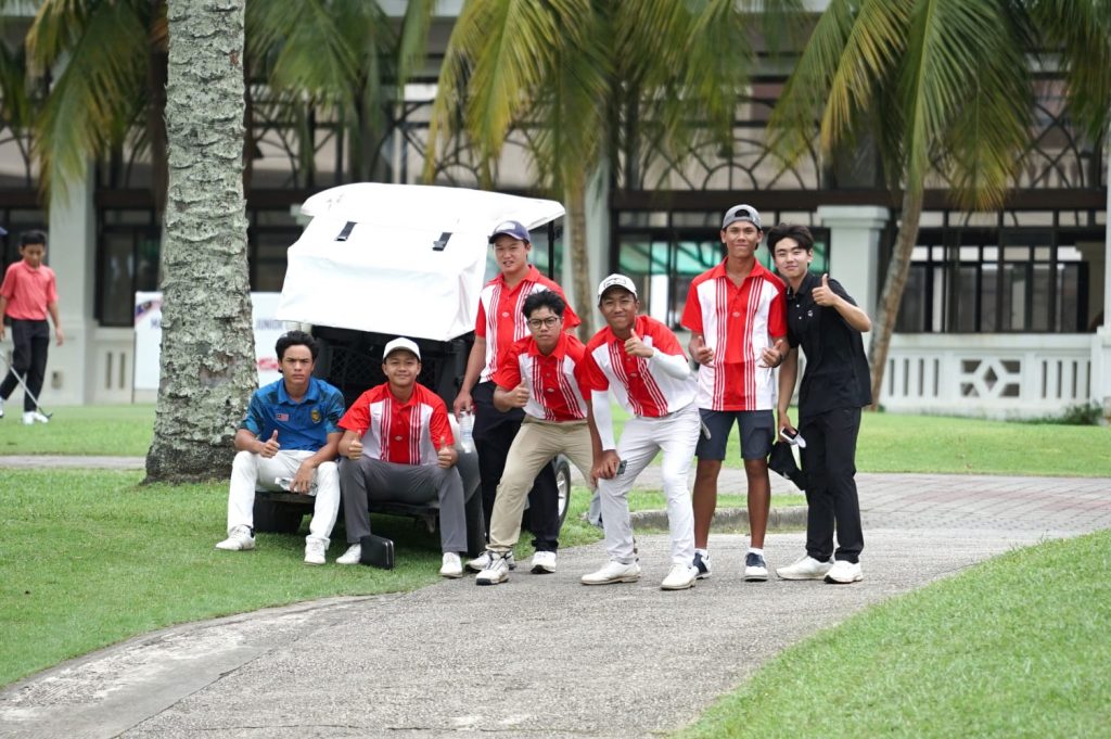 Seunggu Kang dari Korea Selatan, Aiden Tai Malaysia, serta Mohammad Afham Othma, pegolf junior Malaysia yang bermain di Divisi B Putra, yang menemani Teuku Husein menjalani final round dari tee box #1 par 5 yang tee time pada pukul 09.30 waktu Johor.