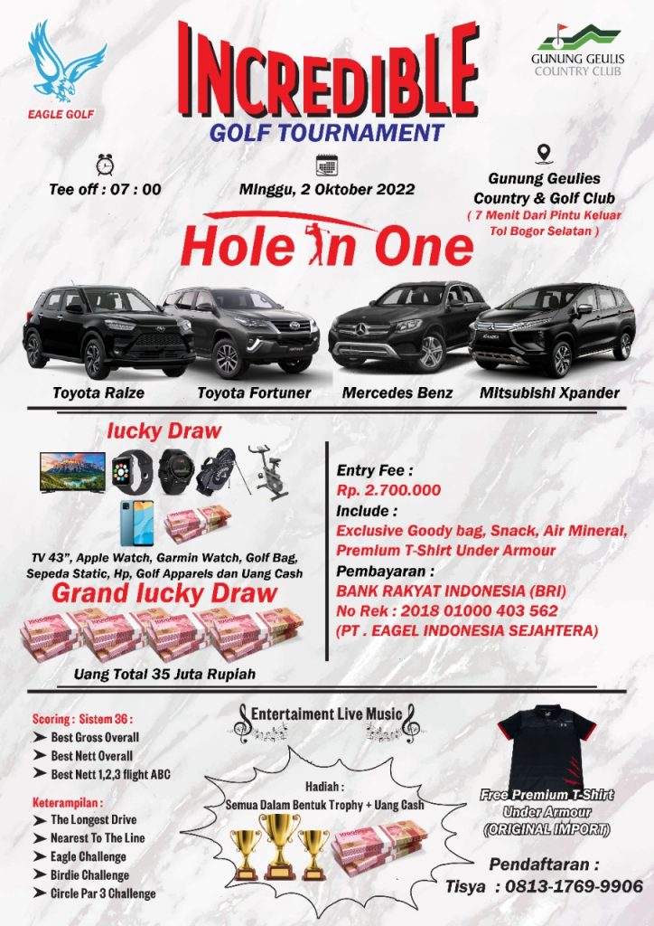 “Hadiahnya tetap sama seperti yang ada di flyer, ada hadiah hole in one mobil, lucky draw golf bag, TV, uang tunai, grand lucky draw 20 juta, dan lain-lain,” tambahnya.