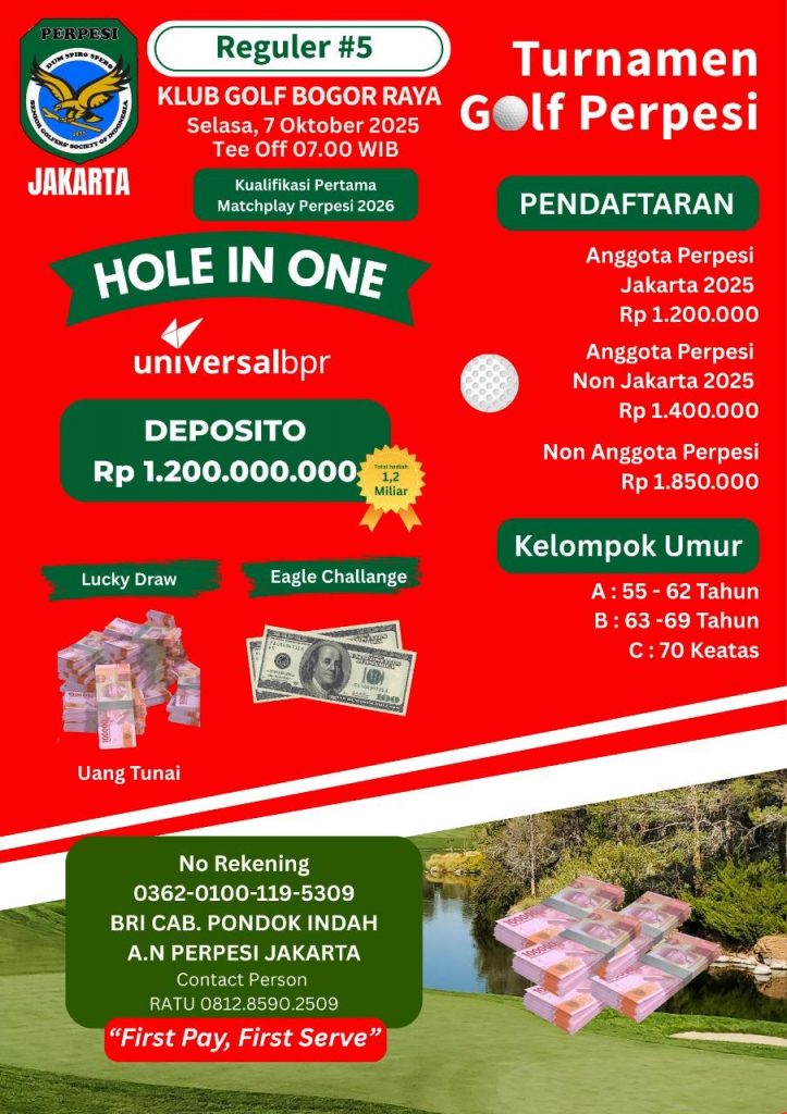 Untuk itulah Perhimpunan Pegolf Senior Indonesia (PERPESI) Jakarta kembali akan menggelar turnamen golf reguler di Klub Golf Bogor Raya pada Selasa 7 Oktober. Turnamen kelima tahun 2025 ini akan memulai tee off pada pukul 07:00.
