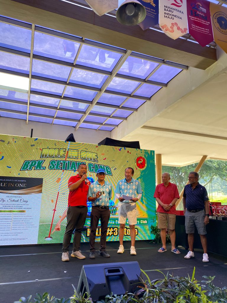 Hole in one tercipta di gelaran turnamen bulanan Fella Golf Club Jakarta di Rainbow Hills Golf Club Bogor, Jumat 11 Juli 2025 oleh pegolf senior Setiadi Cang yang diganjar hadiah senilai ratusan juta rupiah serta hadiah membership IronCard senilai Rp30 juta plus free 12 kali turnamen IronCard.